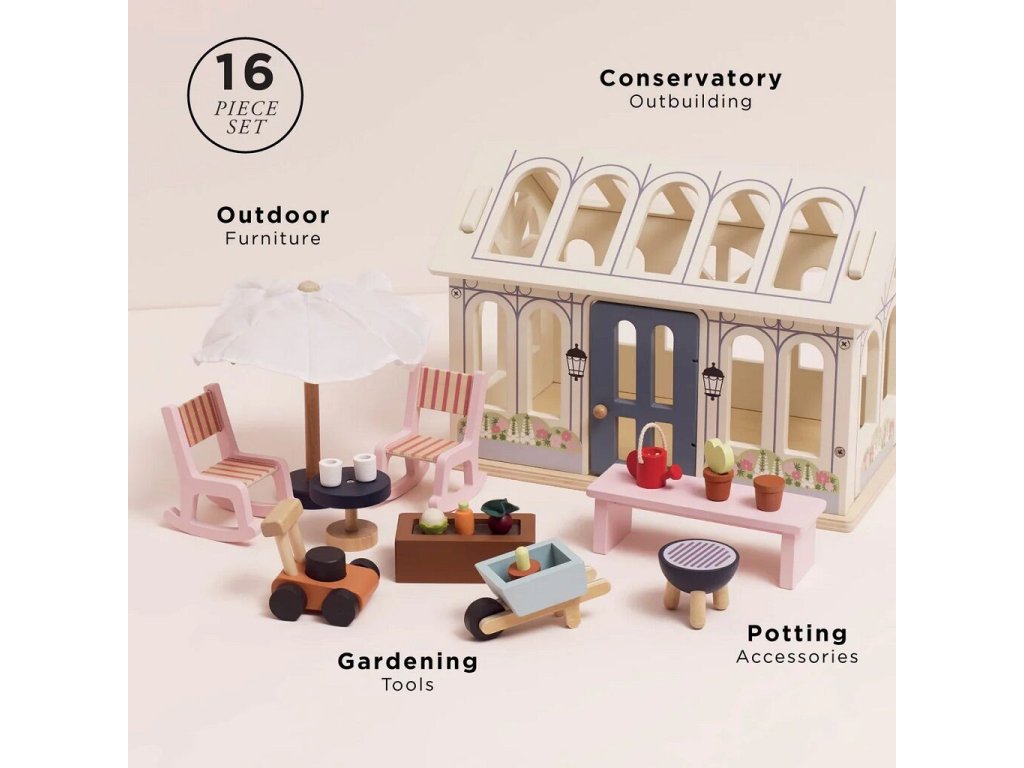 Součástí setu jsou realistické detailní doplňky: zahradní nábytek, posezení, květináče, gril, taburetky, zahradní nářadí jako sekačka nebo kolečko, květinové truhlíky, květinové záhony a dekorace, to vše pro dokončení zahradní atmosféry, kterou si děti i jejich panenky zamilují. Tento zahradní domeček s doplňky podporuje kreativní a představivou hru, rozvoj fantazie, jemné motoriky a sociální hry. Děti mohou pěstovat rostliny a dobroty na zahrádce, uspořádat piknik, grilování nebo zahradní posezení pro svou panenkovou rodinu.