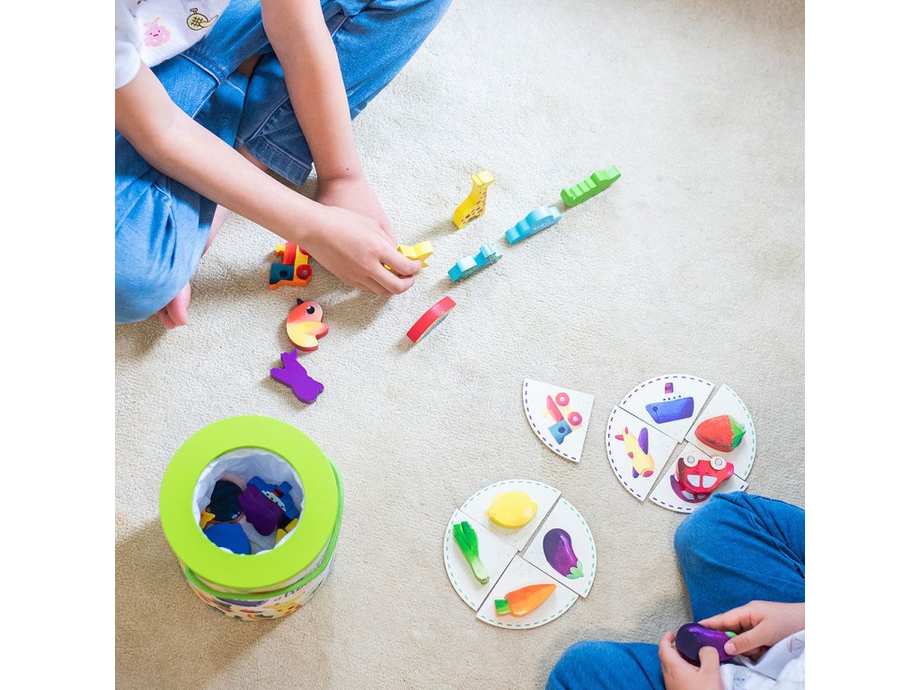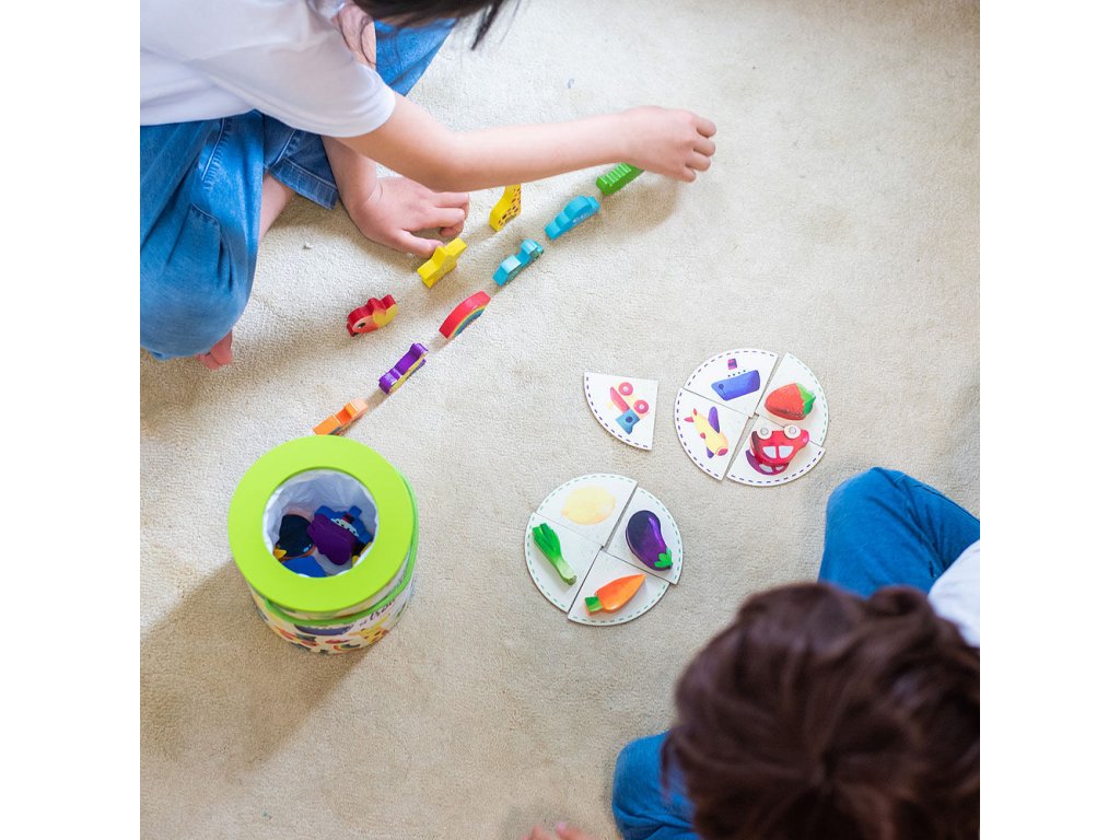 Složte 4 karty do kruhu a vytvořte jeden nebo více herních polí pro každého hráče. Jeden z hráčů nebo rodič vytáhne dílek ze sáčku a vyvolá ho. Hráč, který má kartu odpovídající tomuto vyvolanému dílku, si jej vezme a položí na svou kartičku. Hráč, který jako první zaplní své herní pole, vyhrává!
