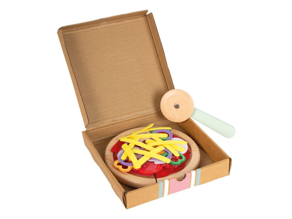 Tato pevná kartonová krabice na pizzu s veselým potiskem ukrývá vše, co děti potřebují k přípravě vlastní pizzy. Uvnitř najdou čtyři dřevěné plátky pizzy, které jsou spojeny suchým zipem – dají se tedy snadno „nakrájet“ pomocí přiloženého dřevěného kráječe. Stejně jako opravdová pizza! Sada obsahuje i různé plstěné ingredience: cibuli, houby, papriku, rajčata, klobásu a sýr. Nechybí ani oboustranná rajčatová omáčka – z jedné strany s potiskem bylinek, z druhé bez. Děti si tak mohou pizzu upravovat podle vlastní fantazie znovu a znovu. Hra podporuje jemnou motoriku, kreativitu i rozvoj sociálních dovedností při společné hře. Skvěle se hodí i jako doplněk do dětské kuchyňky. Krabice slouží nejen ke hře, ale i k uložení všech dílů. Díky tomu je hračka snadno skladná a děti mají po hraní uklizeno raz dva.
