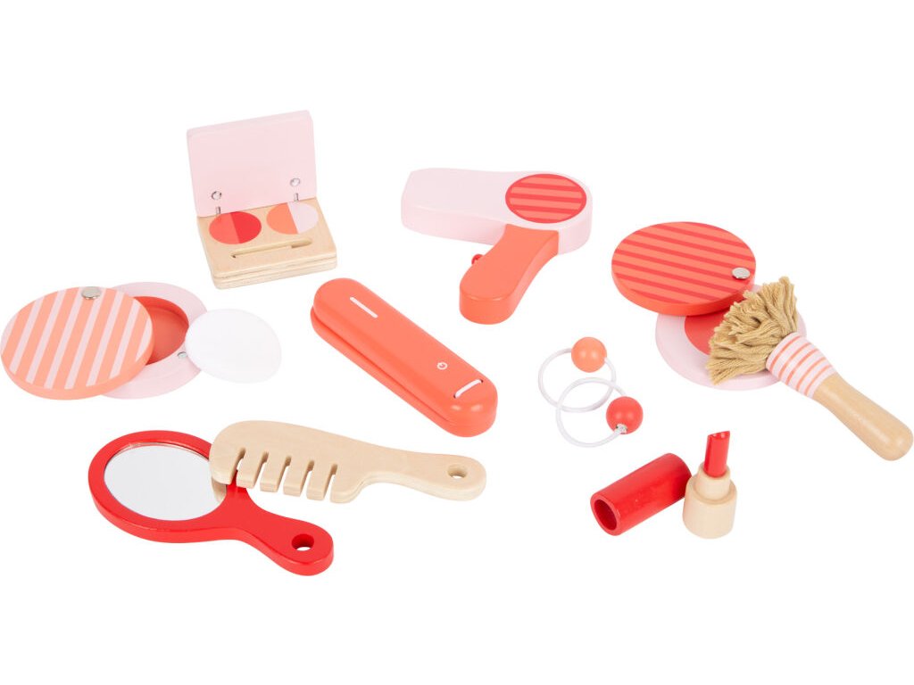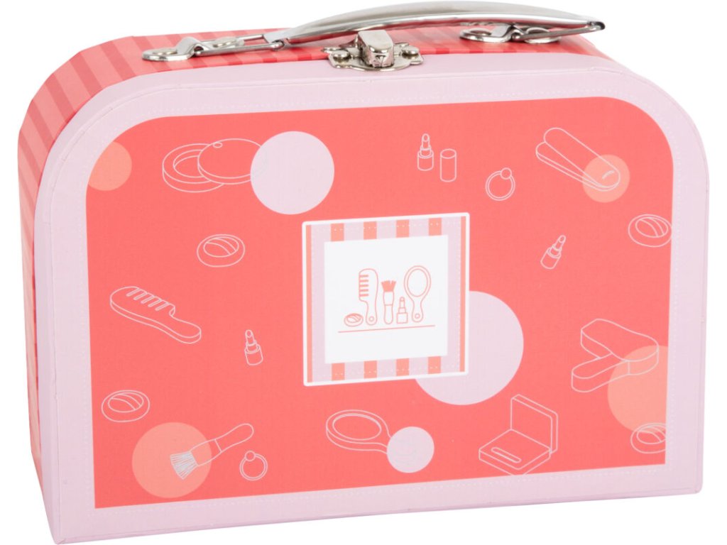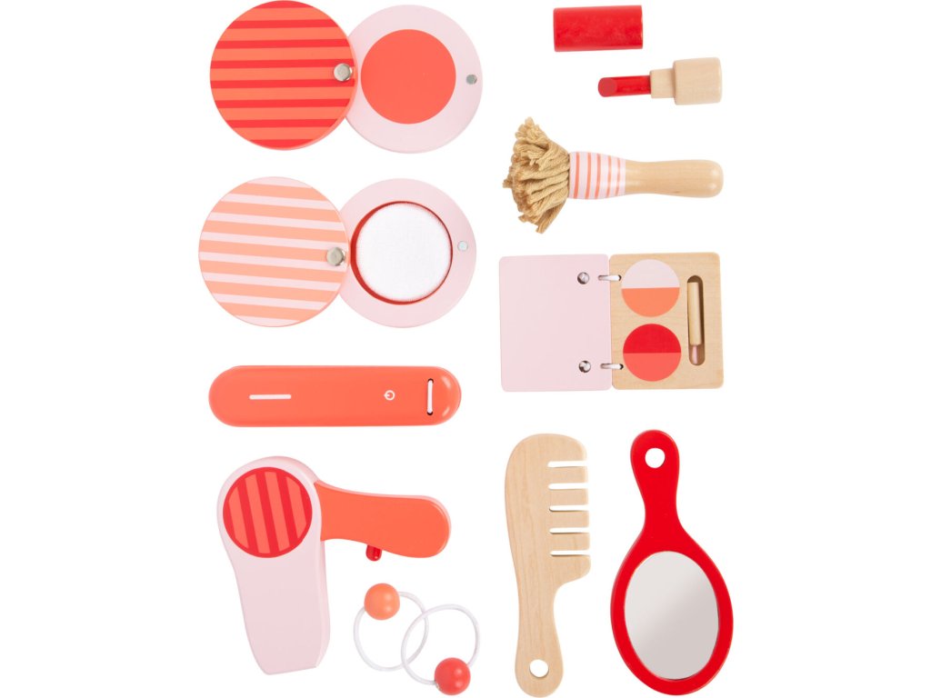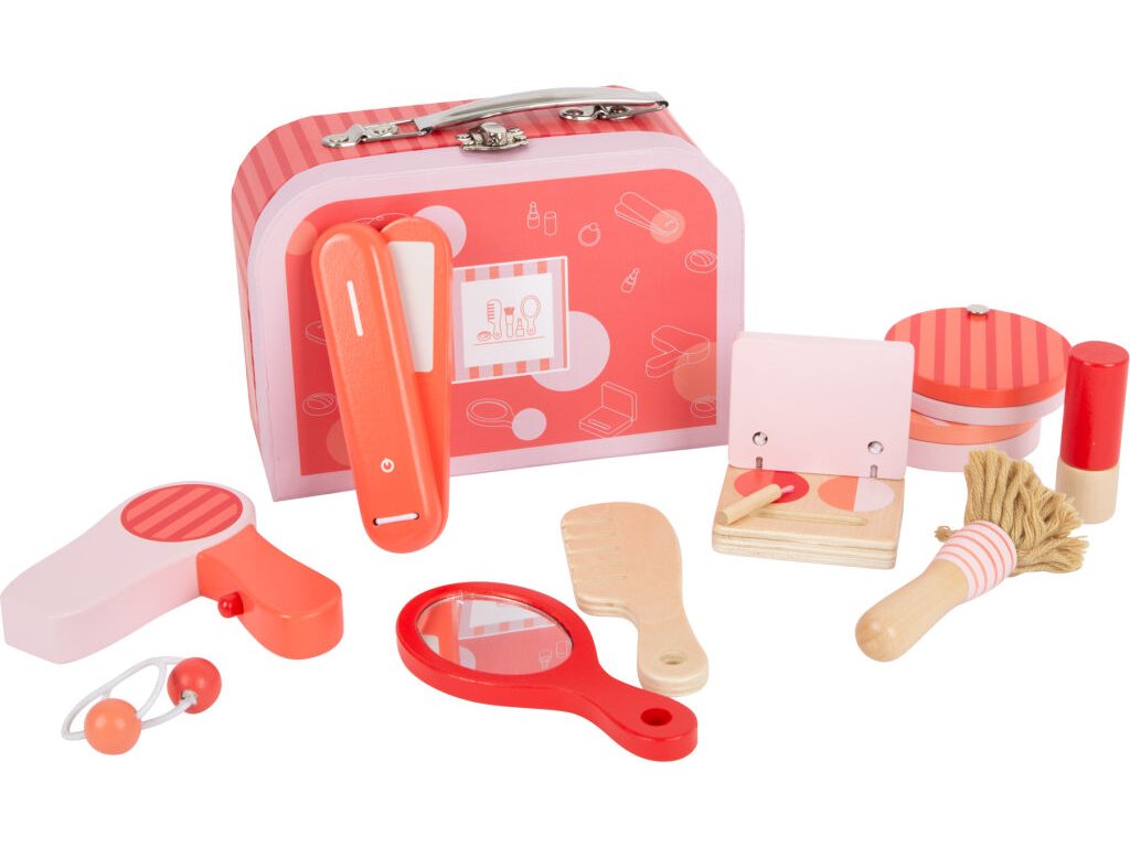 Make-up umělci a umělkyně, toto je pro vás! Kosmetický kufřík vyrobený ze dřeva je perfektní pro hraní na role. Obsáhlý set se skládá z hřebenu, zrcátka, fénu, rtěnky, pudru, očních stínů, žehličky na vlasy a také gumiček. Konečně se můžete namalovat jako maminka! Kufřík má zámek, všechny doplňky se do něj vejdou pohodlně. Kdo si nechá upravit vlasy jako první?