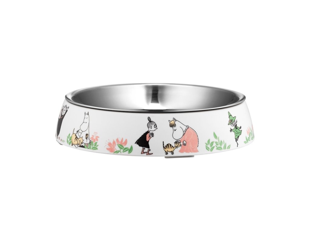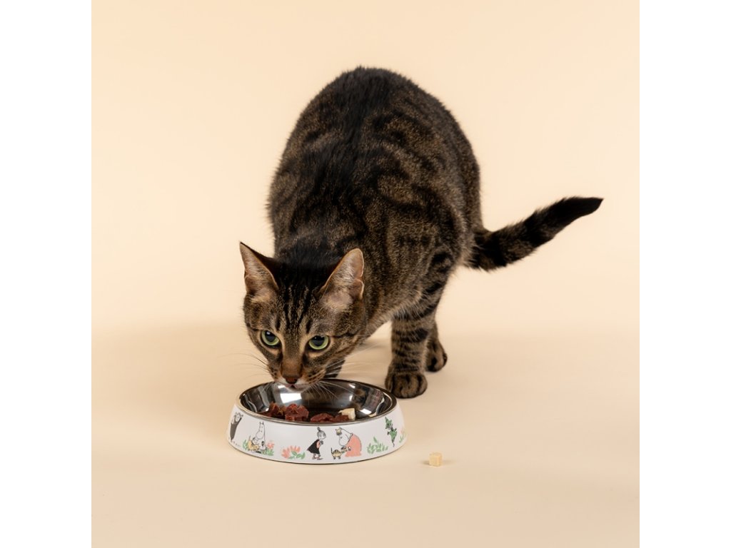 Stylová nerezová miska pro kočky s motivem Mumínků má protiskluzové dno a můžete ji umývat v myčce.