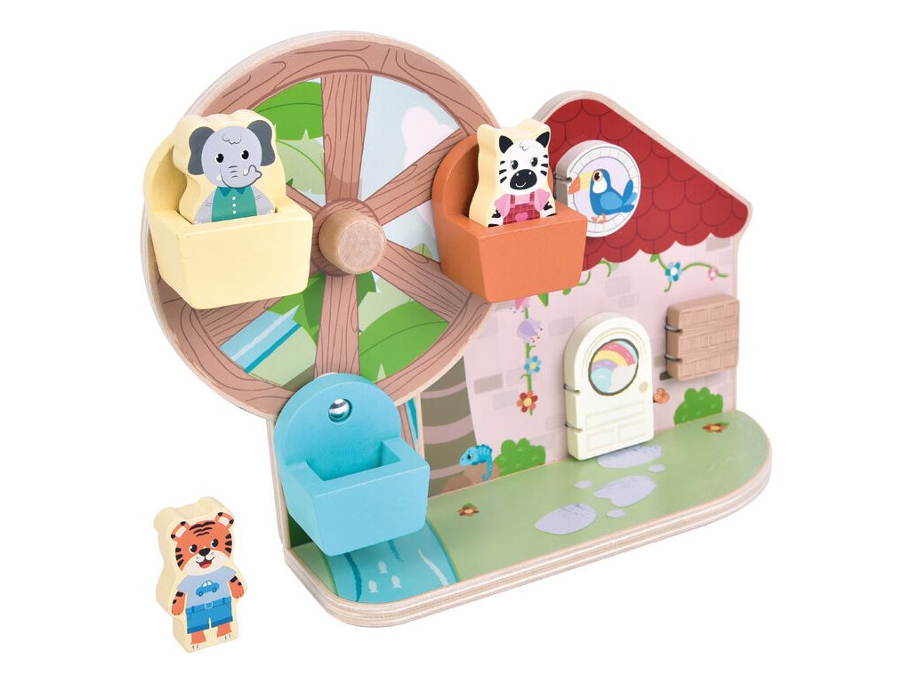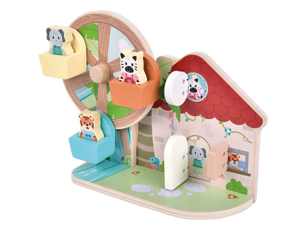 Tři roztomilé dřevěné postavičky – tygr, zebra a slon se vydávají na veselou jízdu na kolotoči, zatímco stejné zvířecí motivy děti objevují za třemi barevnými dvířky na přilehlém domečku.