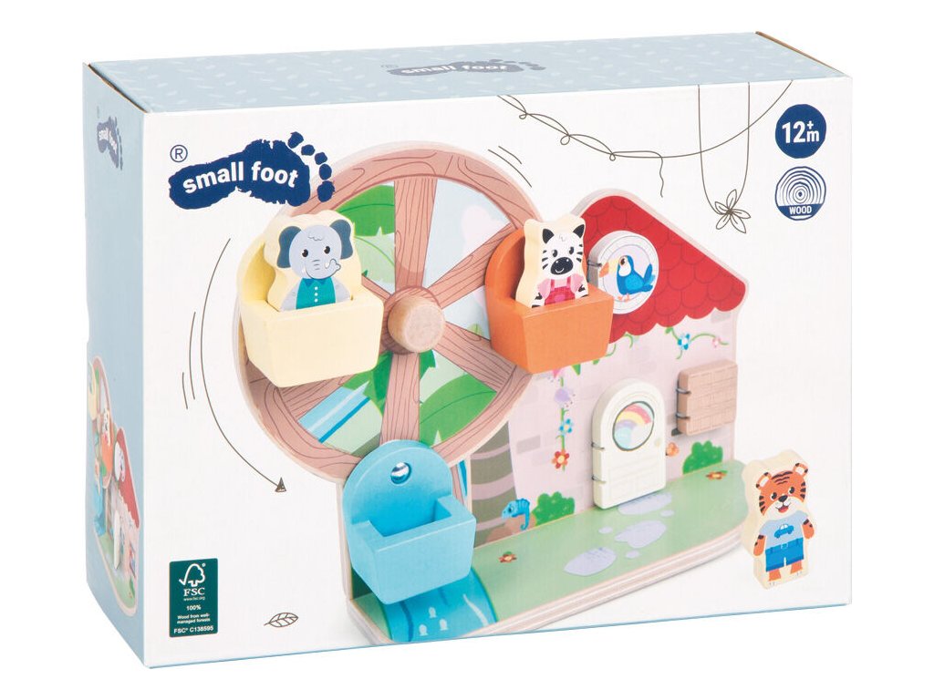 Toto krásně navržené dřevěné ruské kolo z 100% FSC® certifikovaného dřeva přináší do dětského pokoje zábavu, pohyb i učení v jednom! Tři roztomilé dřevěné postavičky – tygr, zebra a slon se vydávají na veselou jízdu na kolotoči, zatímco stejné zvířecí motivy děti objevují za třemi barevnými dvířky na přilehlém domečku.