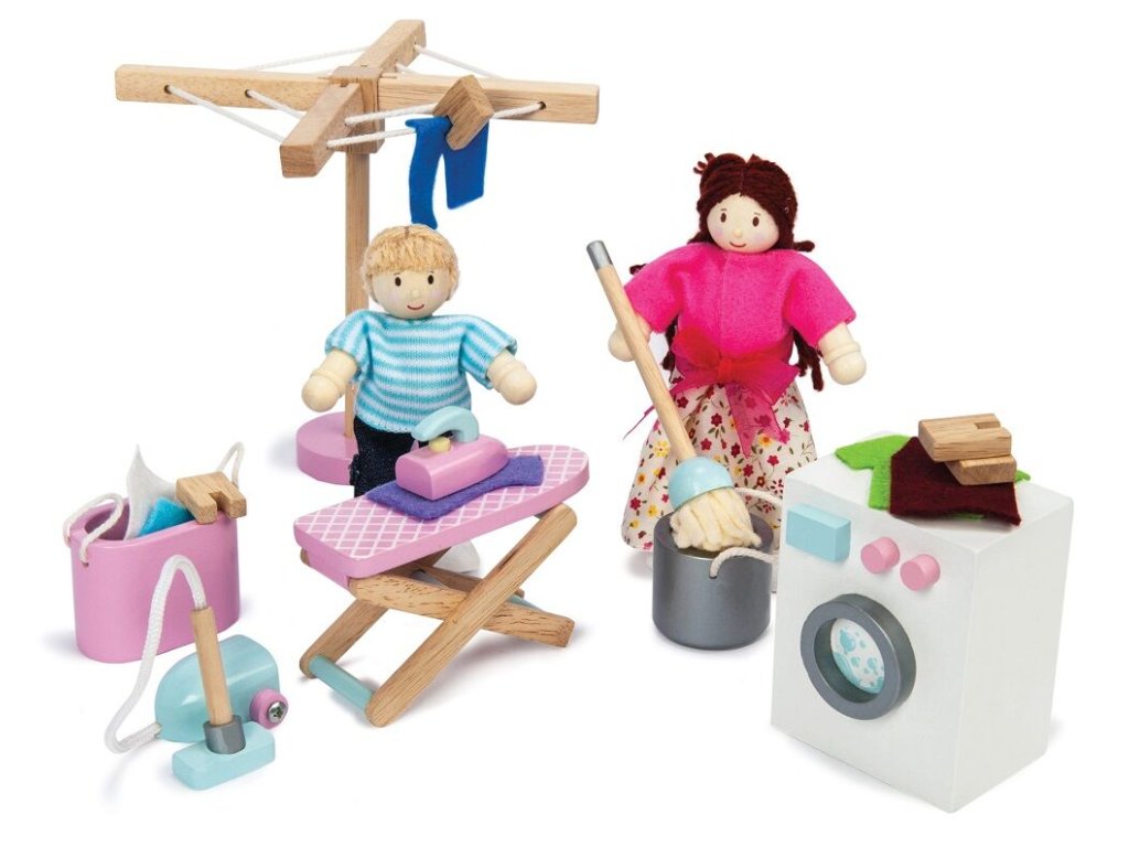 Dřevěný nábytek do domečku pro panenky. Kompletní sada spotřebičů a příslušenství pro dokonalý úklid. Sada obsahuje pračku, vysavač, žehličku, sušák na prádlo s kolíčky, žehlící prkno, koš, kbelíky a mop.