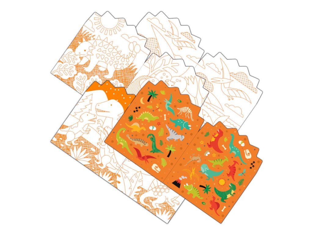Připravte pastelky! Scény s oblíbenými dětskými postavičkami, či zvířaty lze po vybarvení dozdobit některými z velké sady přibalených pestrobarevných samolepek. Jednoduché roztomilé tvary děti nadchnou a rozjitří jejich fantazii. Vyrobeno z udržitelně získaného papíru.