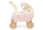 Tento dřevěný kočárek pro panenky má tradiční design a krásný styl s mnoha detaily. Pastelová růžová, krémová bílá, krajky.