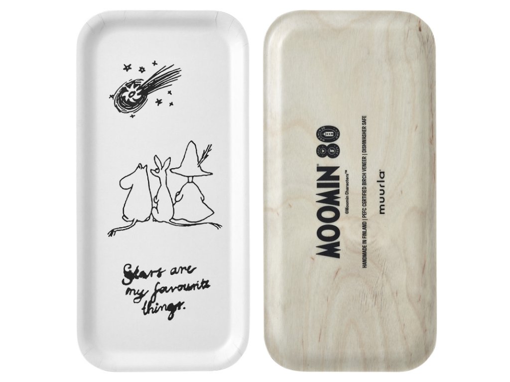Krásný podnos potěší všechny milovníky muminků retro motivy k 80. výročí oblíbených pohádek od finské autorky Tove Jansson. Díky své praktické velikosti lze tento tác použít k servírování koláčů či dezertů spolu s šálkem kávy nebo čaje. Podnos nese ze spodní strany výroční logo a vyrábí ručně přímo ve Finsku z finského březové překližky.