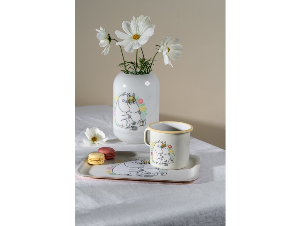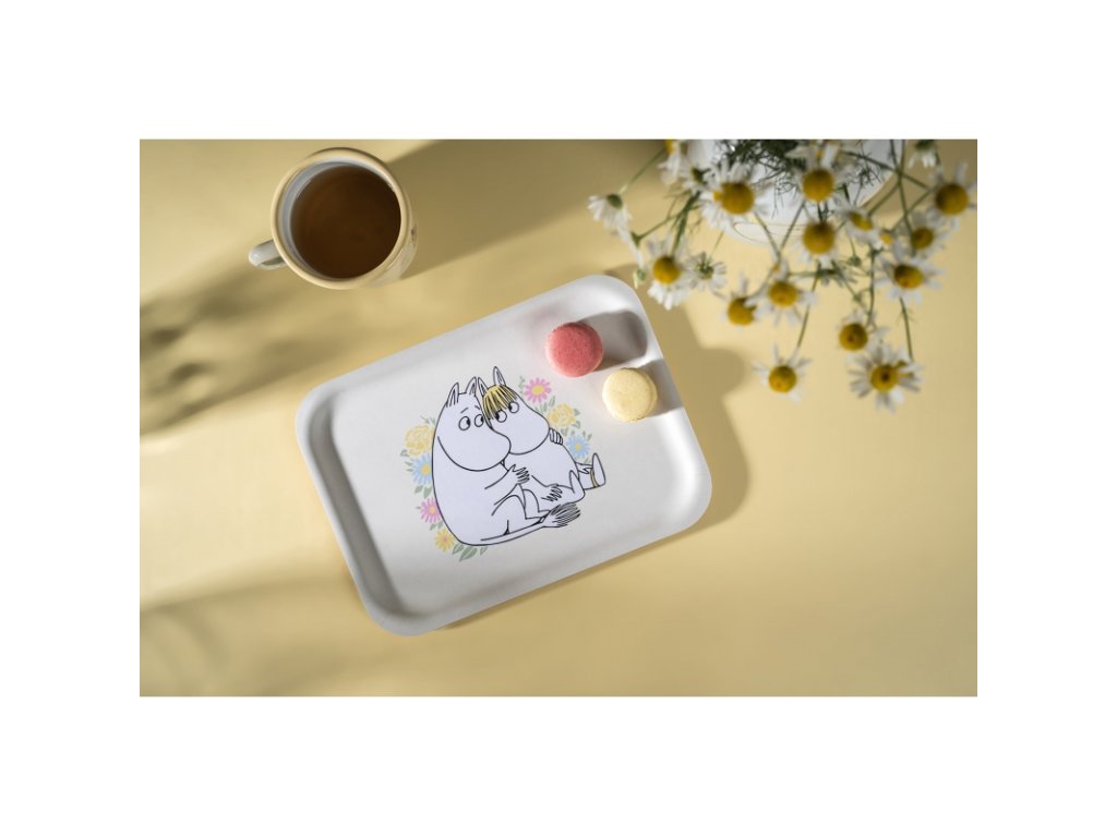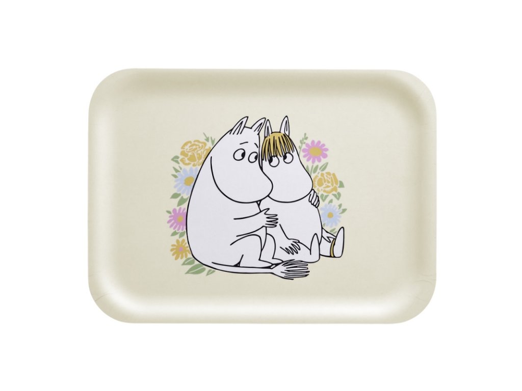 Krásný podnos v pastelově žlutém odstínu z kolekce Flowers nese milý motiv tulícího se Muminka k slečně Ferce. Ze spodní strany podnosu je navíc úryvek s ilustrací z původní knihy. Podnosy se vyrábí přímo ve Finsku a z finské březové překližky.
