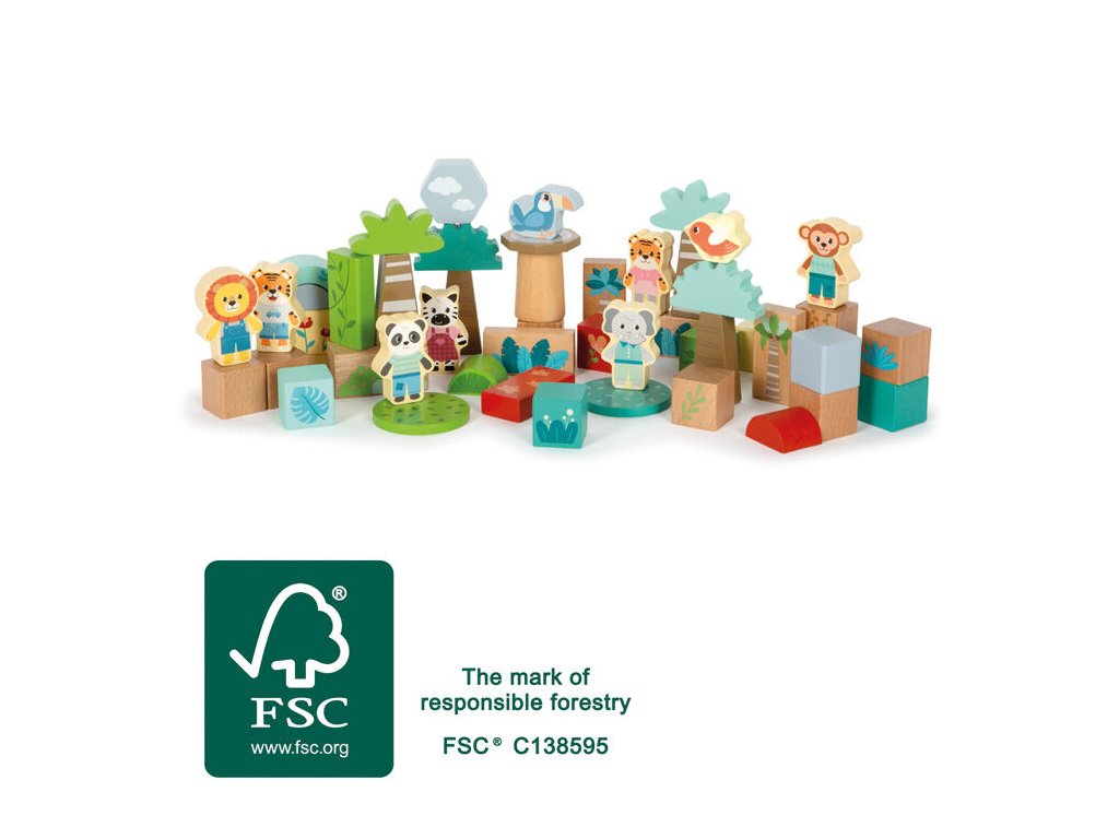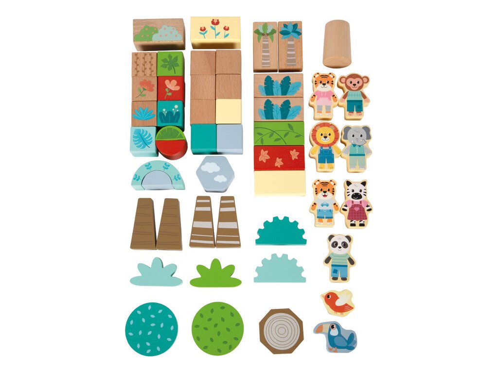 Tato barevná 50dílná dřevěná stavebnice vyrobená ze 100% certifikovaného FSC® dřeva přináší do dětského pokoje veselý svět džungle plný zvířecích dobrodružství. Sada potěší různě tvarovanými a potištěnými stavebními kostkami, doplněnými o roztomilé figurky zvířat, jako jsou tygři, pandy, opičky a ptáčci. Díky široké škále tvarů, barev a motivů mohou děti stavět zvířecí krajiny, vysoké věže nebo kreativní scény – fantazii se meze nekladou! Hra s kostkami rozvíjí jemnou motoriku, koordinaci a prostorové myšlení, zatímco zvířecí figurky a potištěné prvky s listy, rostlinami a přírodními motivy inspirují děti k vyprávění vlastních příběhů.